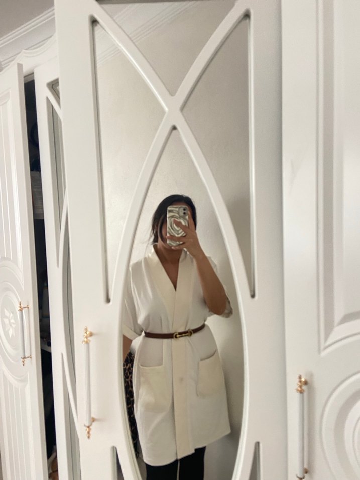 Beyaz midi yelek , kısa kollu ve regular fit kesime sahiptir. Minimalist tarzda, cepli , desen içermeyen sade tasarıma sahiptir.