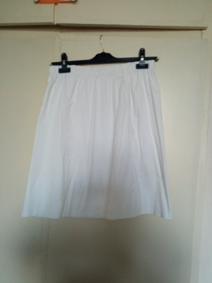 Yumuşak keten kumaştan, bol kesim beyaz midi hamile eteği. Minimalist tarzda, günlük sokak giyimine uygun, zahmetsiz şıklık sunar.