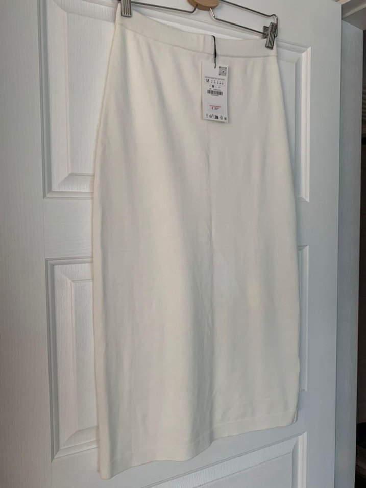 Beyaz midi keten etek, hafif kumaş ve rahat kesimle ofis şıklığını minimal ve desensiz tasarımla tamamlar.