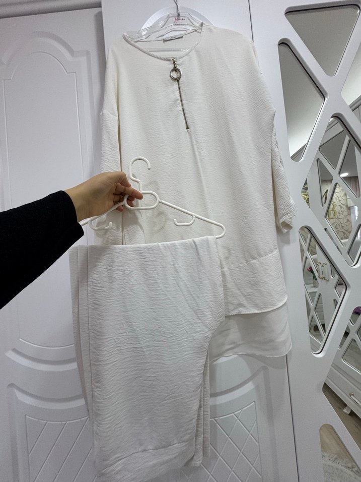 Yumuşak keten kumaştan yapılmış, bol kesim beyaz kadın takımı. Yuvarlak yaka, uzun kollu ve önünde fermuar bulunur. Midi boy, minimal desensiz tasarım günlük kullanıma uygundur.