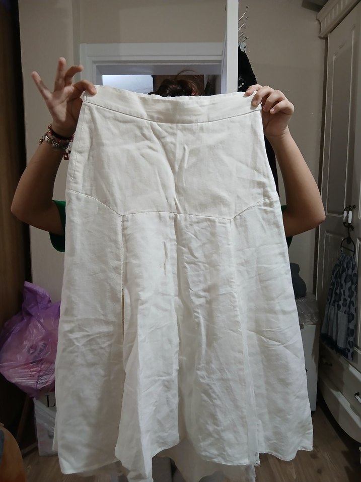 Beyaz Midi Keten Pilili Salaş Etek