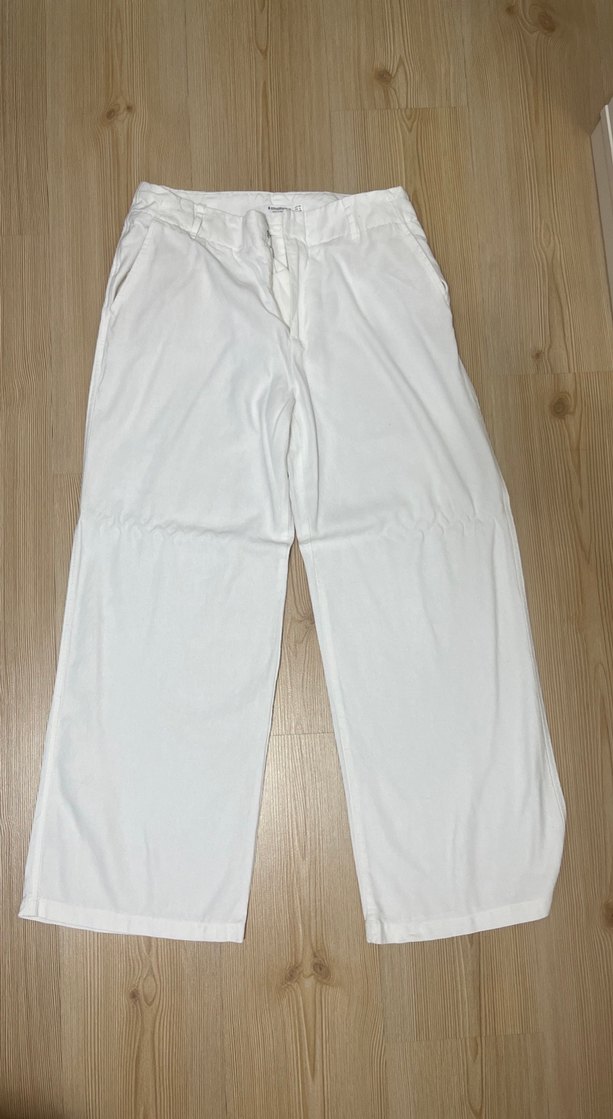 Beyaz keten kumaştan, salaş kesim midi uzunlukta kadın pantolon. Minimalist normcore tarzıyla rahat ve şık bir görünüm sunar. bır kere yıkandı boyu ıkı cm cektı
