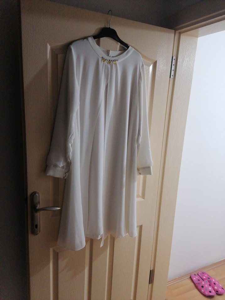 Uzun kollu, keten kumaştan beyaz midi tunik. Drapeli ve bol kesim, yuvarlak yaka ile minimal ve klasik tarzda günlük kullanım için uygun.