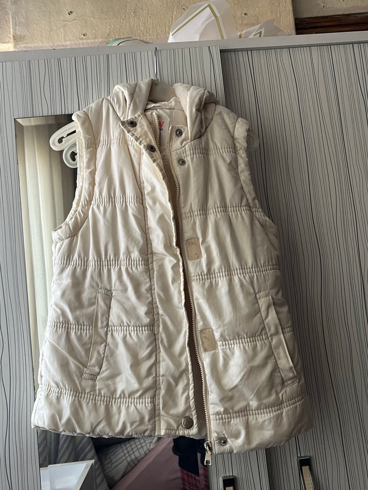 kolsuz beyaz yelek, yumuşak ve sıcak kumaştan, normal midi boyda ve yakalı, günlük kullanım için uygundur.