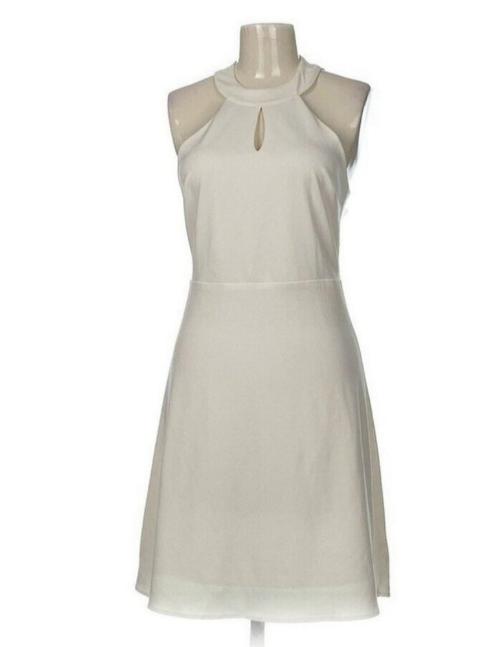 Beyaz, kolsuz, yüksek yakalı ve vücuda oturan midi elbise. Gardrops premium ile aldım olmadığı için satıyorum