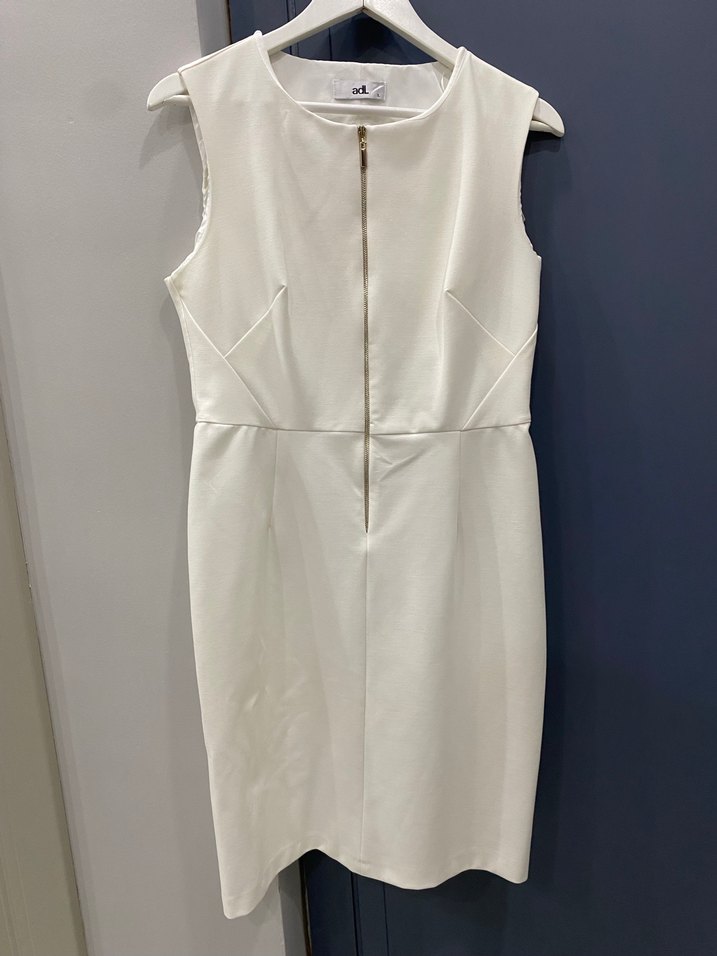 Kolsuz, V yakalı, fermuarlı beyaz midi elbise. Düzenli kesim ve modern klasik tarzı ile ofis için uygundur.