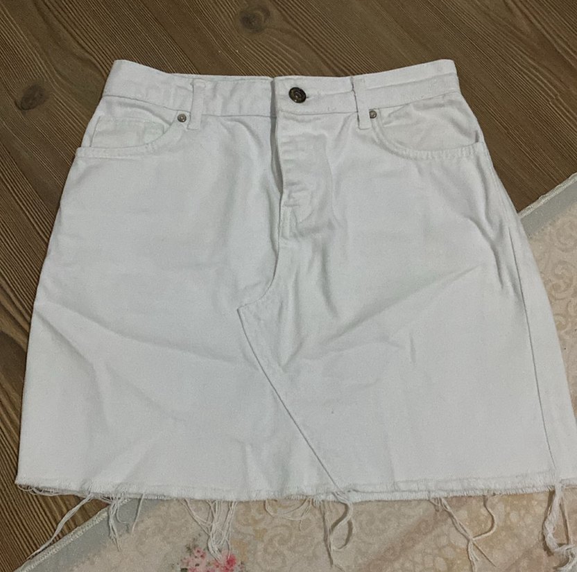 Beyaz midi kot etek, rahat kesimi ve yıpranmış etek ucu ile günlük sokak stili için uygundur. Sade tasarımı günlük kullanıma idealdir.