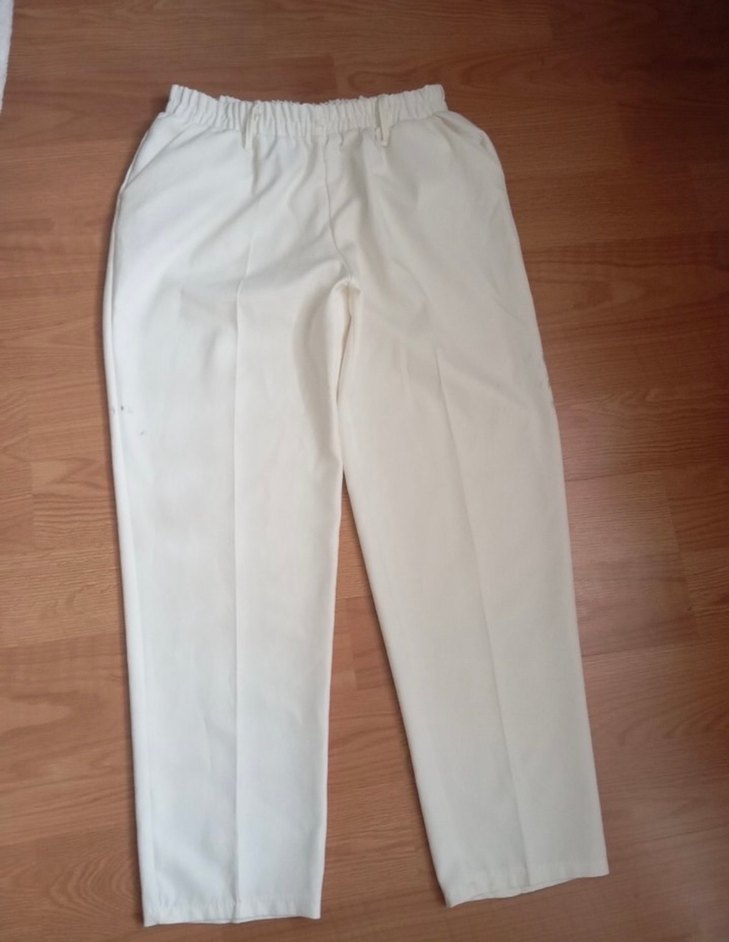 Beyaz midi uzunlukta, regular fit ve lastikli bel detaylı kadın kumaş pantolon. Yumuşak sentetik kumaştan üretilmiş, ofis için uygun minimalist normcore tarzda. ✨
