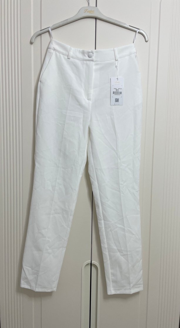 Beyaz, midi boy, sentetik kumaştan, regular fit kesime sahip, minimalist tarzda kadın pantolon. Ofis kullanımı için uygun. ✨