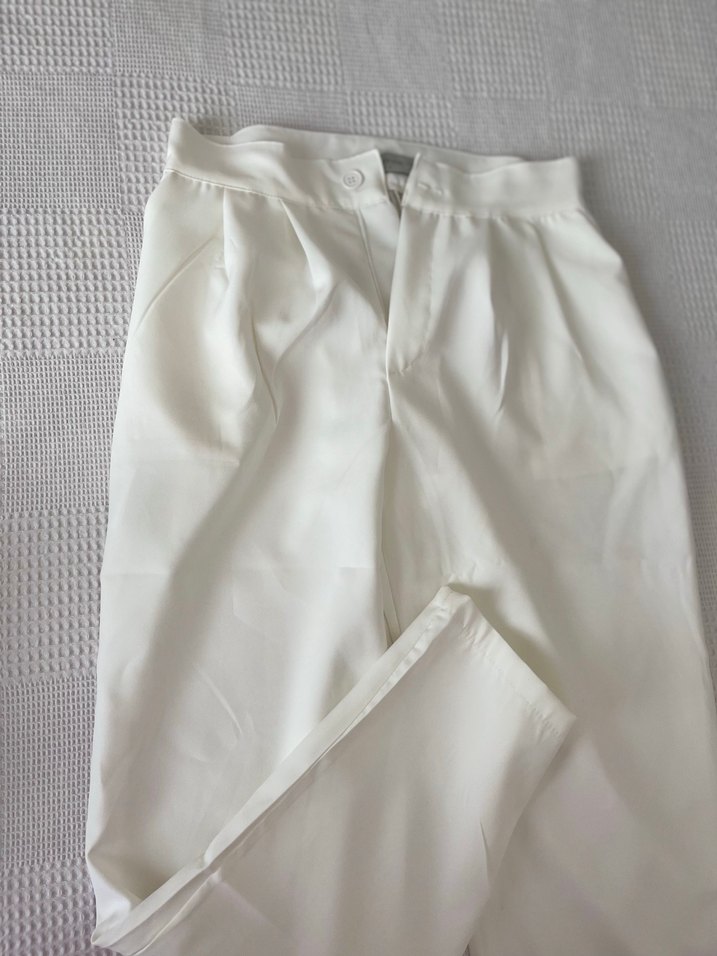 Beyaz midi boy, regular kesim kadın pantolon. Düz, sentetik kumaştan, minimalist normcore tarzında, günlük kullanıma uygun.