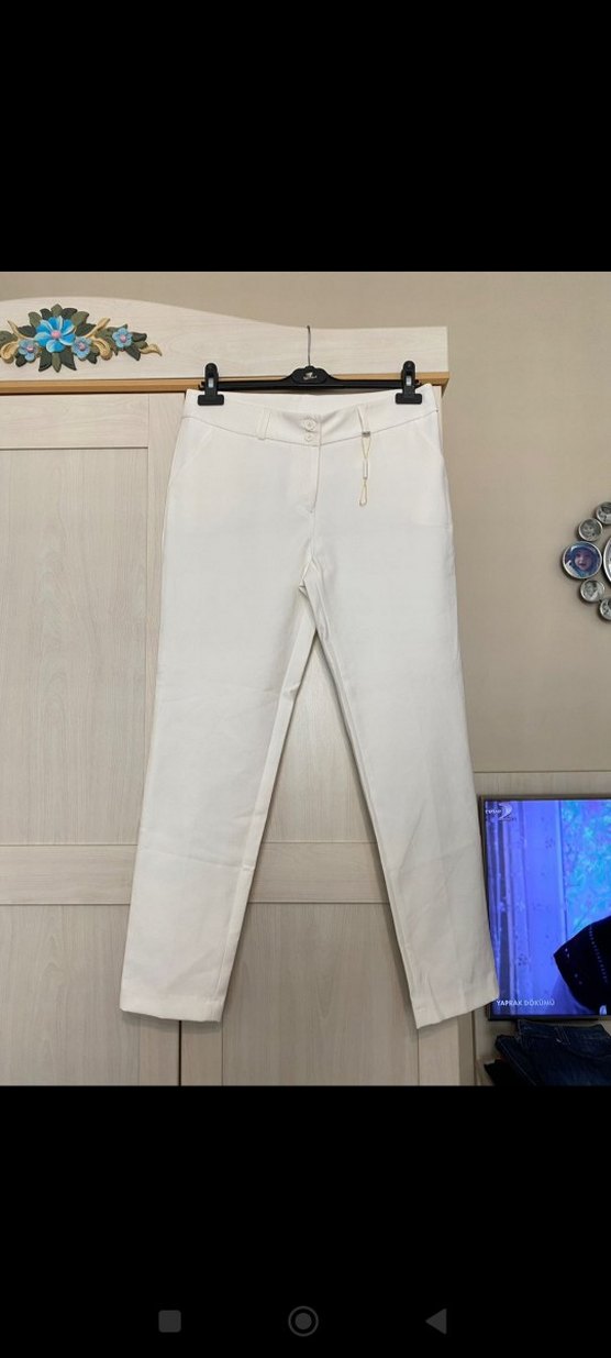 Beyaz midi uzunlukta kumaş pantolon, regular fit kesim ve kemerli bel detayına sahiptir. Pürüzsüz sentetik kumaştan üretilmiş, ofis için uygun, sokak stiline uygun rahat bir modeldir.