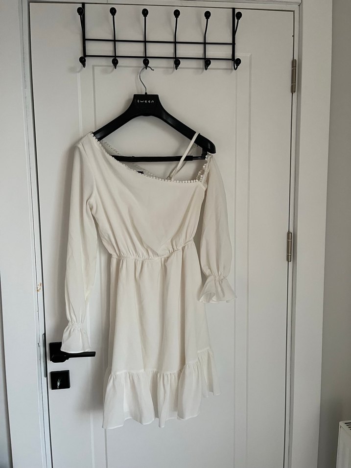 Beyaz midi mini gelinlik, V yaka ve askılı kollara sahip. Gevşek kesimi ve modern klasik tarzıyla Paris esintisi taşır.