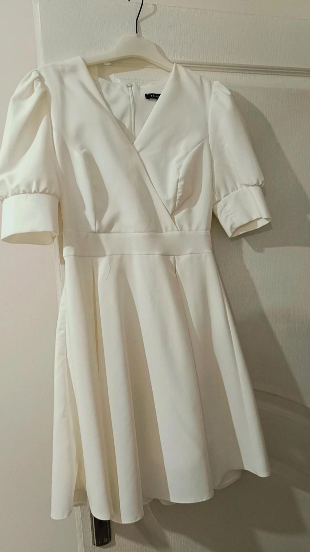 Beyaz midi elbise, kısa kollu ve normal kesimdir. Modern klasik Paris tarzını yansıtan desensiz şık bir modeldir.