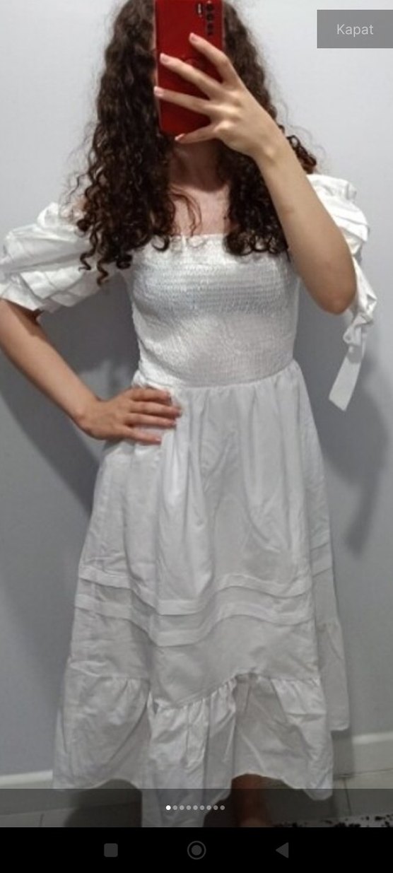 Pamuklu beyaz midi elbise, tek renk ve bol kesimdir. Kayık yaka ve kısa fırfırlı kollara sahiptir, bohem tarzı için uygundur.