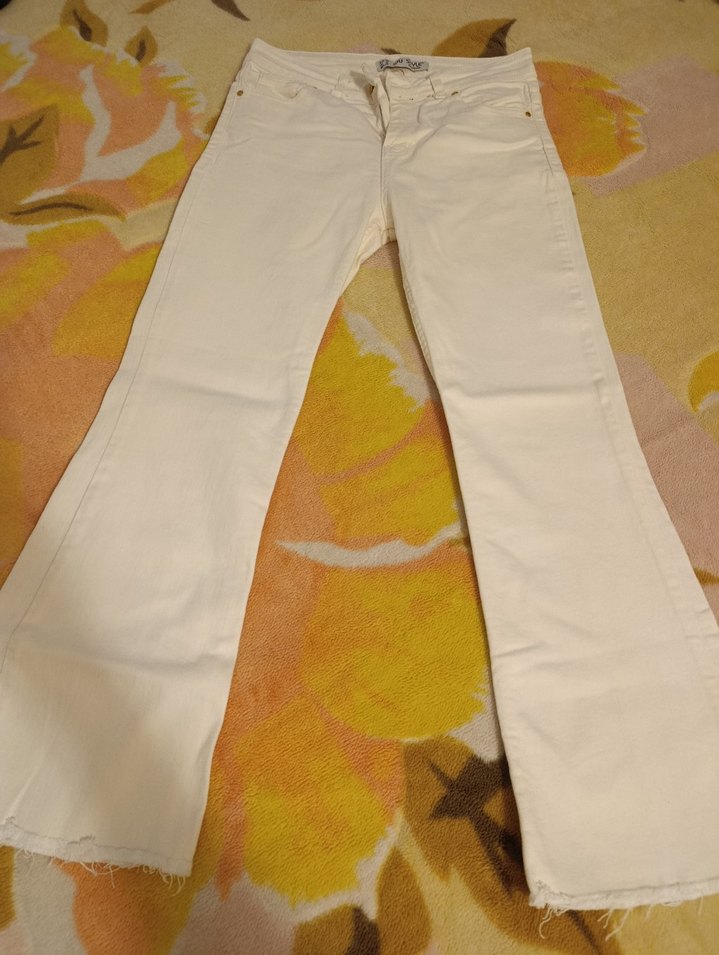 Beyaz midi boy, regular fit kadın kot pantolon günlük kullanım için rahat ve şık. bedeni fotoğraflarda mevcut