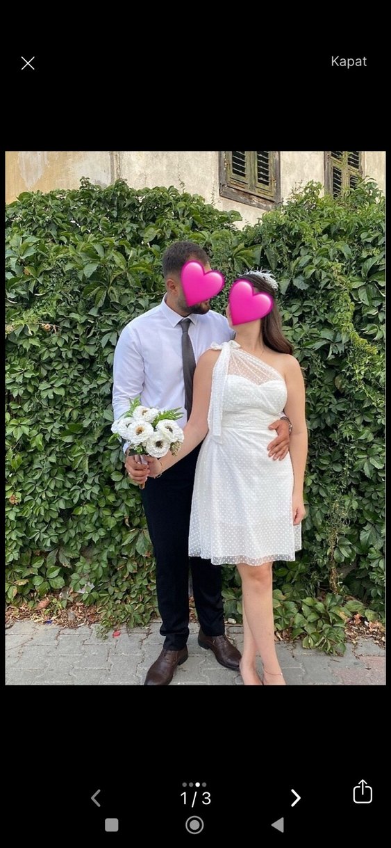 Beyaz, straplez yaka ve ince askılı, vücuda oturan A kesim gelinlik. Midi boy ve minimalist tarzda, modaya uygun bir seçim.