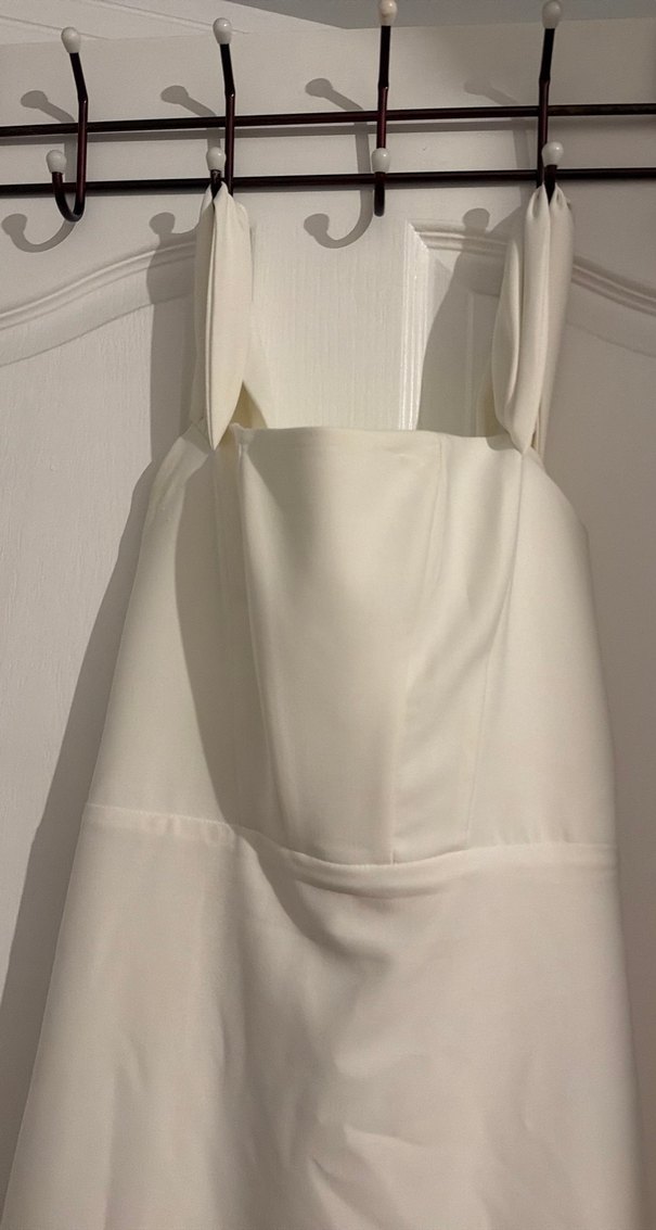 Bu beyaz midi gelinlik, straplez yaka ve kolsuz tasarımı ile sade ve minimalist bir tarz sunar.