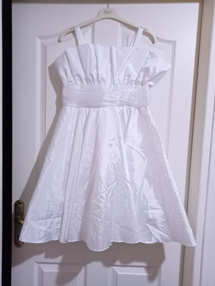 Beyaz midi gelinlik, straplez yaka ve ince askılarla klasik Paris tarzını yansıtıyor. Oturmalı üst kısmı ve konvansiyonel etek boyu ile zamansız bir şıklık sunar.