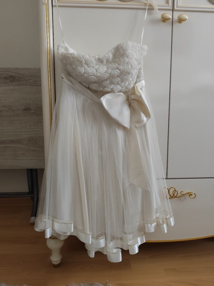 Beyaz midi uzunluğunda, straplez ve çiçek detaylı mini gelinlik. İnce askılı, oturan kesim ve fiyonk detayı ile modern klasik tarzda bir tasarım.