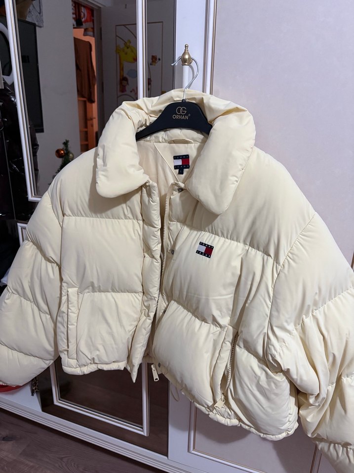Beyaz, düğmeli, yüksek yakalı ve uzun kollu, midi boyda rahat kesimli kadın kışlık ceket. Yumuşak ve sıcak kumaştan üretilmiştir. ❄️