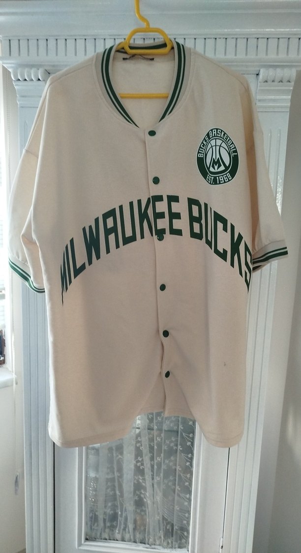 Beyaz renkli, kısa kollu, düğmeli ve bol kesim erkek forma. Üzerinde Milwaukee Bucks baskıları vardır, spor ve sokak stili için uygundur.