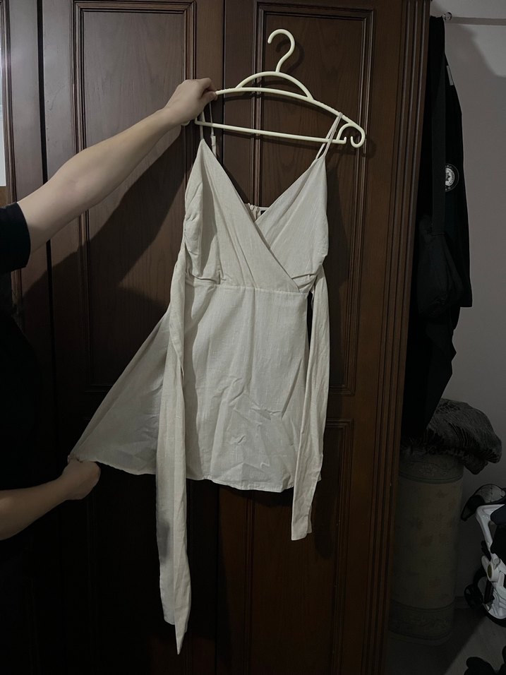 Beyaz renkli, askılı kısa elbise. Halter yaka ve beli oturan kesimi ile konfor sağlar. Düz ve açık renklidir.