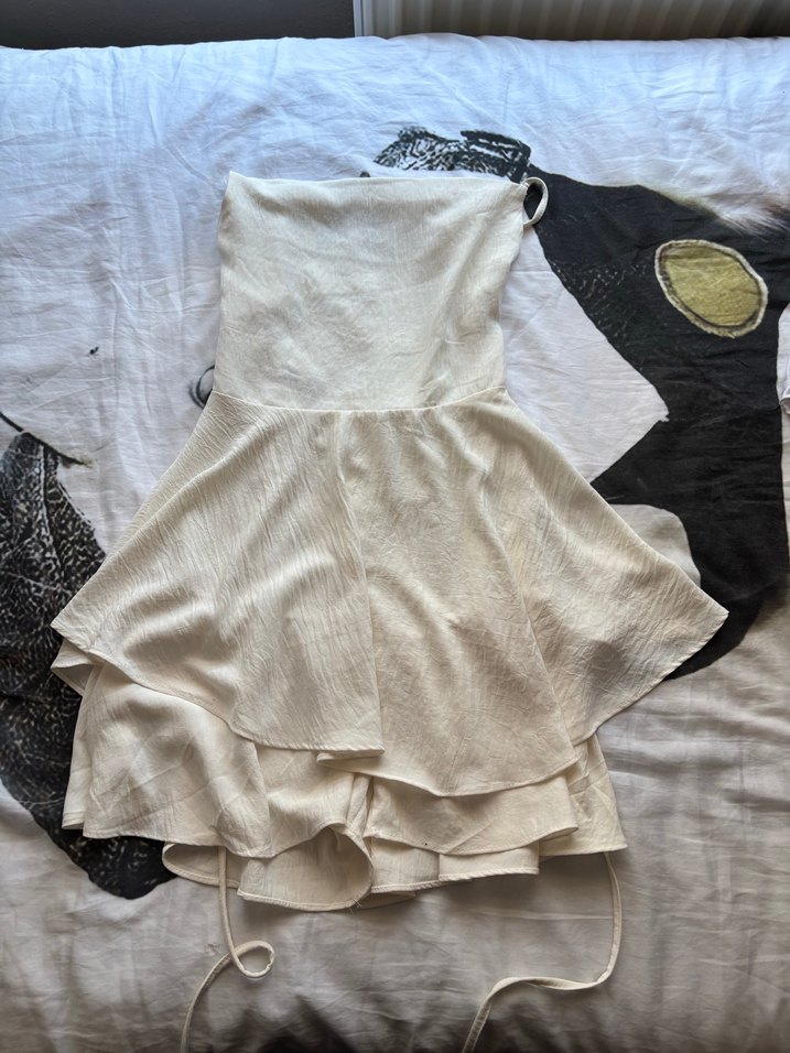 Beyaz mini elbise straplez yaka ve askılı tasarımıyla, oturan üst kısmı ve geniş etek kısmı şorlu ve şık bir görünüm sunar.