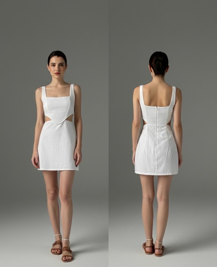 Pamuk kumaştan yapılmış, straplez yaka ve ince askılı, kesik detaylı beyaz mini elbise. Romantik akşamlar için uygundur.