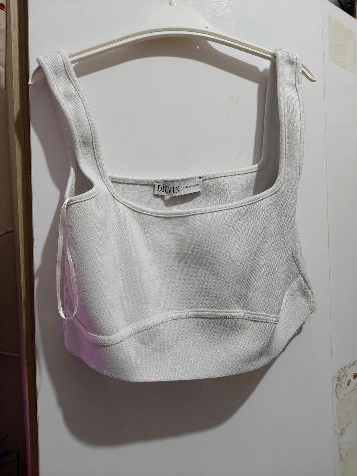 Beyaz, kısa ve fitted kesim büstiyer, kolsuz ve kare yakalıdır. Pürüzsüz sentetik kumaştan üretilmiştir, günlük şık sokak modası için uygundur.