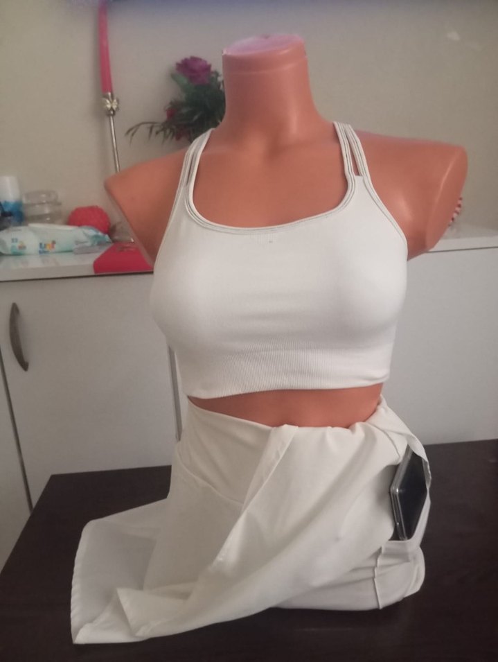 Beyaz, askısız, ince askılı ve kısa etekli atlet takım, sentetik kumaştan, spor ve günlük sokak giyimine uygun.takim 300 tek başına 150