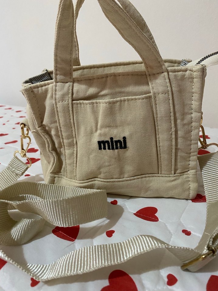 Beyaz tekstil kadın çantası, "mini" baskılı ve fermuarlı kapamalı. Minimalist sokak stiline uygun, saplı ve çıkarılabilir askılıdır.