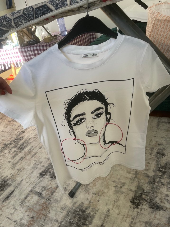 Pamuk beyaz kısa kesim kadın tişörtü, yuvarlak yaka ve kısa kollu. Büyük halka küpelerle minimalist yüz baskısı, rahat kesimiyle trend bir günlük şıklık sunar.