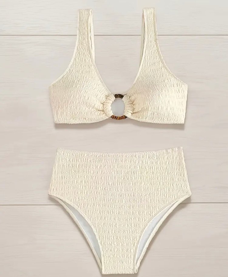 Beyaz, strappy askılı ve bohem tarzda mini bikini takımı. Ön kısmında şık halka detayı bulunur, plaj için minimal ve rahat bir seçim. ️