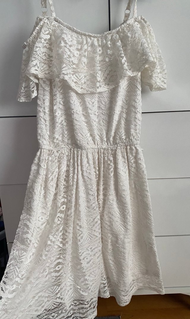 Beyaz dantel detaylı, straplez yaka ve kısa kollu mini bohem elbise. Belden oturan, bol kesim yapısıyla rahat bir tasarım sunar.