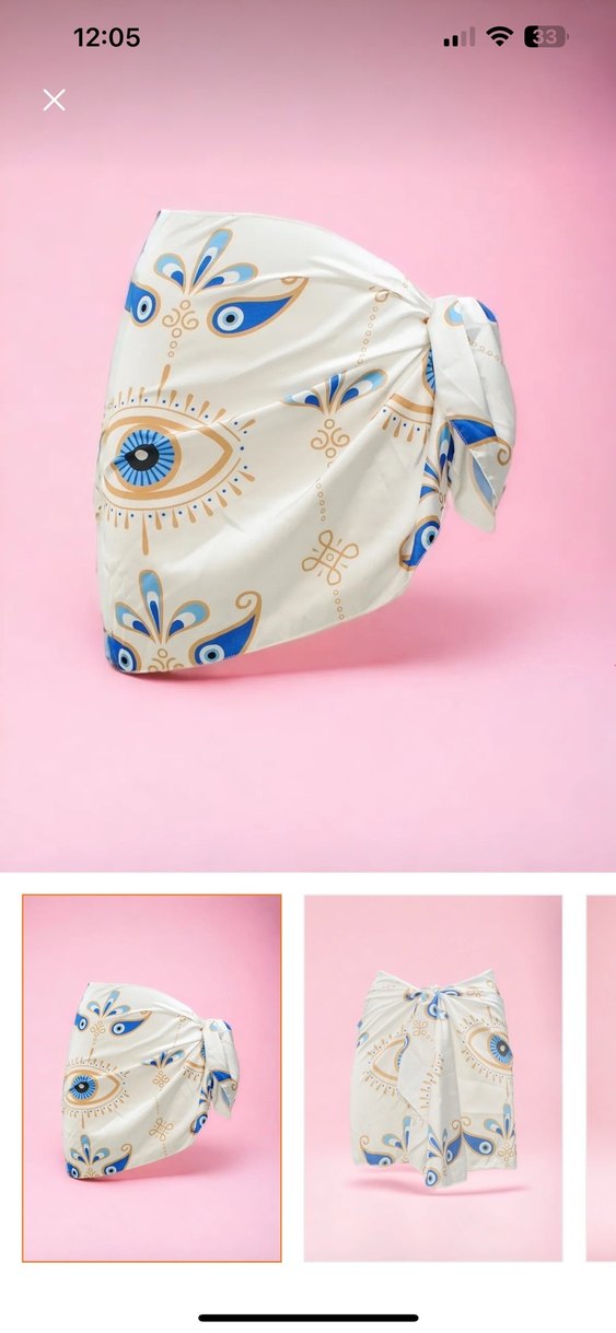 Beyaz mini pareo, mavi göz desenleriyle baskılı, drapeli ve fitted kesim. İnce, hafif kumaş ve askılı detaylar içerir.