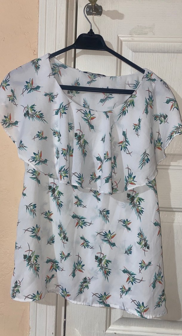 Beyaz mini bluz, kısa kollu ve salaş kesimdir. Tekne yaka ve fırfır detaylarıyla pastel renkli çiçek desenine sahiptir. Rahat sentetik kumaştan üretilmiştir.