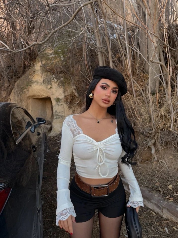 Beyaz , uzun kollu, tekne yaka, etnik dantel ve kürk detaylı mini, dar kesim bluz. Günlük kullanıma uygun.
