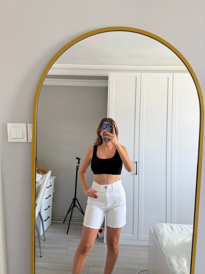 Beyaz, mini boy, fitted denim Bermuda şort. Desensiz ve sade tasarımıyla günlük kullanıma uygun, trend sokak tarzında rahat bir parça.