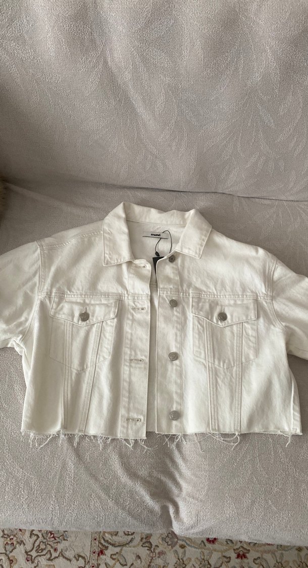 Beyaz renkli, düğmeli, uzun kollu kısa kesim mini denim ceket. Salaş kesimi ve kesik yaka detayıyla gündelik sokak stiline uygun. #mavi #ceket #beyaz #pamuk #etiketli