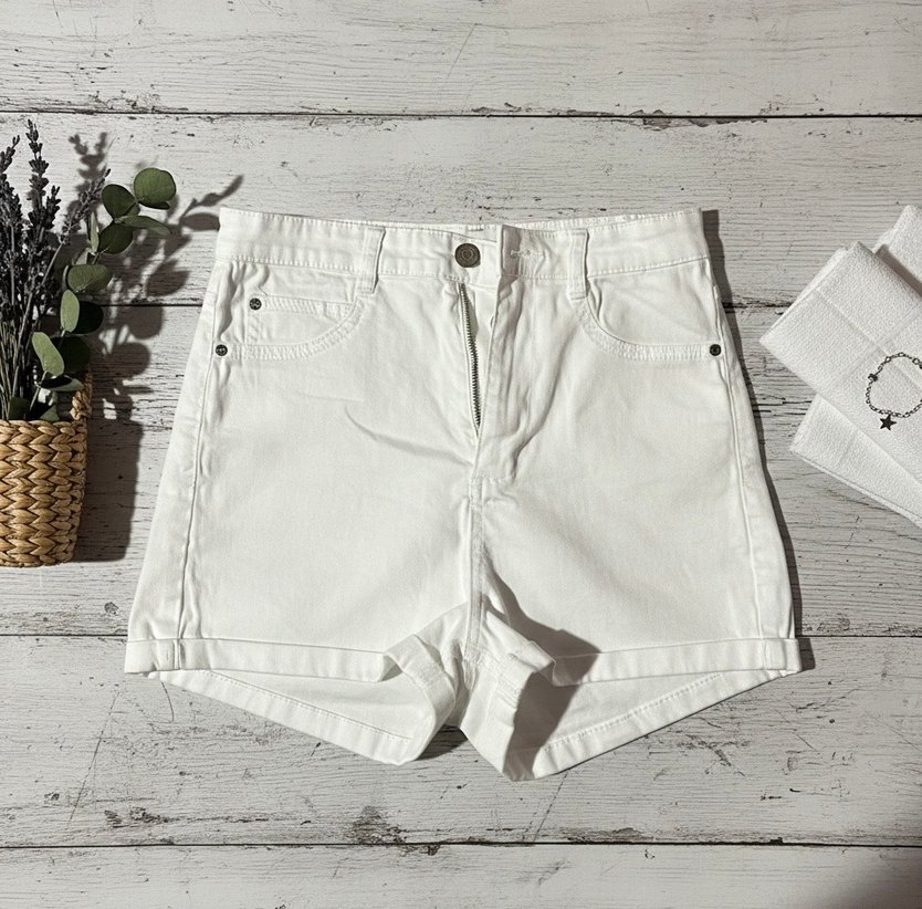 Pamuklu, beyaz renkli, mini boy ve dar kesim denim şort. Günlük sokak stiline uygun sade ve rahat bir tasarım. Effortless chic görünüm sağlar.