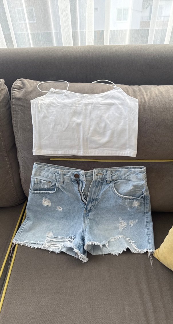 Beyaz renkli, kısa ve rahat kesim kot şort, yıpranmış detaylarıyla günlük sokak stili için uygundur.