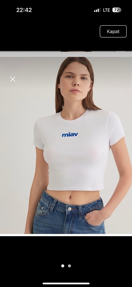 Beyaz mini uzunlukta, kısa kollu, bisiklet yaka ve baskılı "miav" yazılı tişört. Denim kumaştan, gündelik sokak stiline uygun.