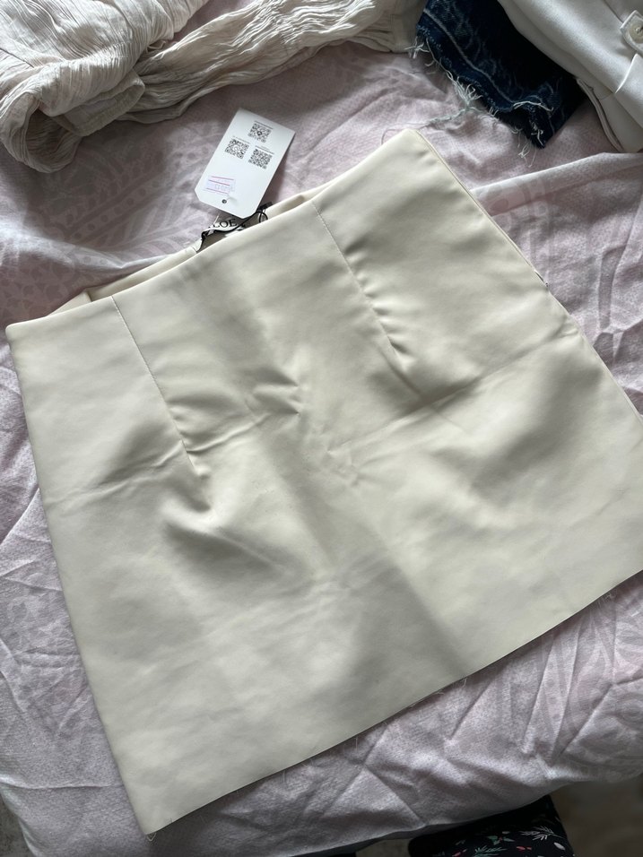 Düz beyaz tasarımlı, fermuarlı ve sentetik kumaştan yapılmış, vücuda oturan mini etek. Sokak stili için uygun, açık hava kullanımı için ideal.