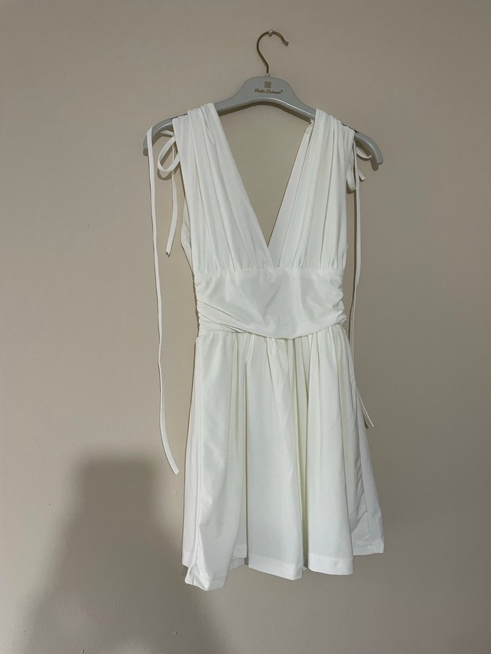 Etiketli V yakalı kısa mini elbise. Şortlu. Ürün temiz ve sorunsuzdur. Herhangi bir leke, yırtık veya deformasyon yoktur. Kullanım durumu: hiç giyilmedi Dolabımda kullanılmadığı için satıyorum. İlgilenenler gönül rahatlığıyla alabilir