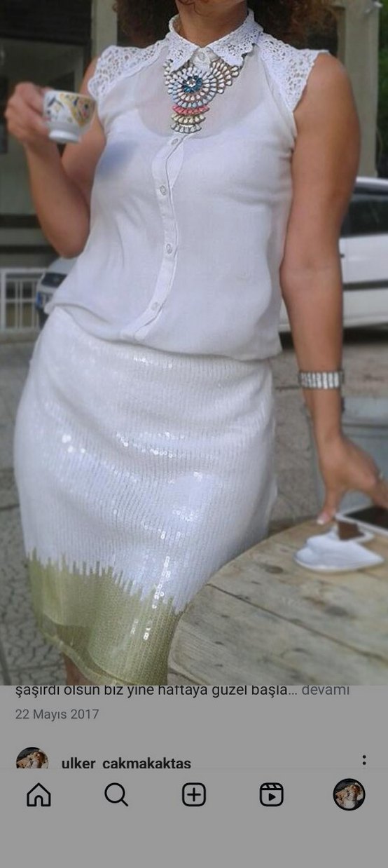 Parlak beyaz kumaştan, kısa ve drapeli tasarıma sahip, bohem tarzda şık pullu eteği. Parti için ideal, vücuda oturan kesimde.