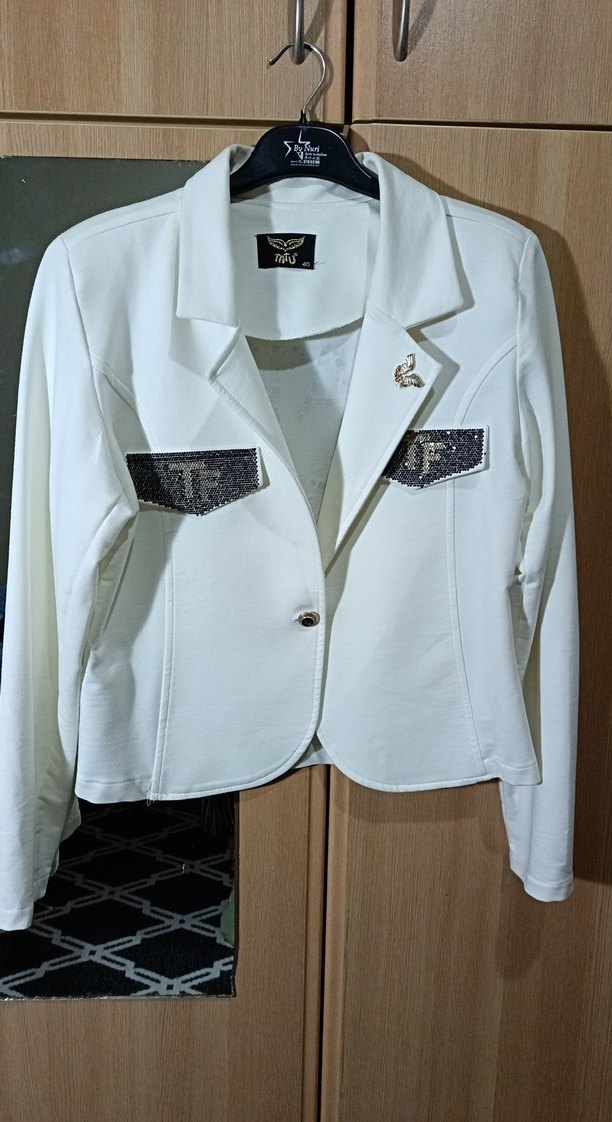 Beyaz mini blazer, kısa uzunlukta,astarsız, düğmeli ve baskılı detaylara sahip. Uzun kollu ve kesimi rahat, ofis veya günlük kullanıma uygun. ✨55 uzunluk, 52 kol altı.