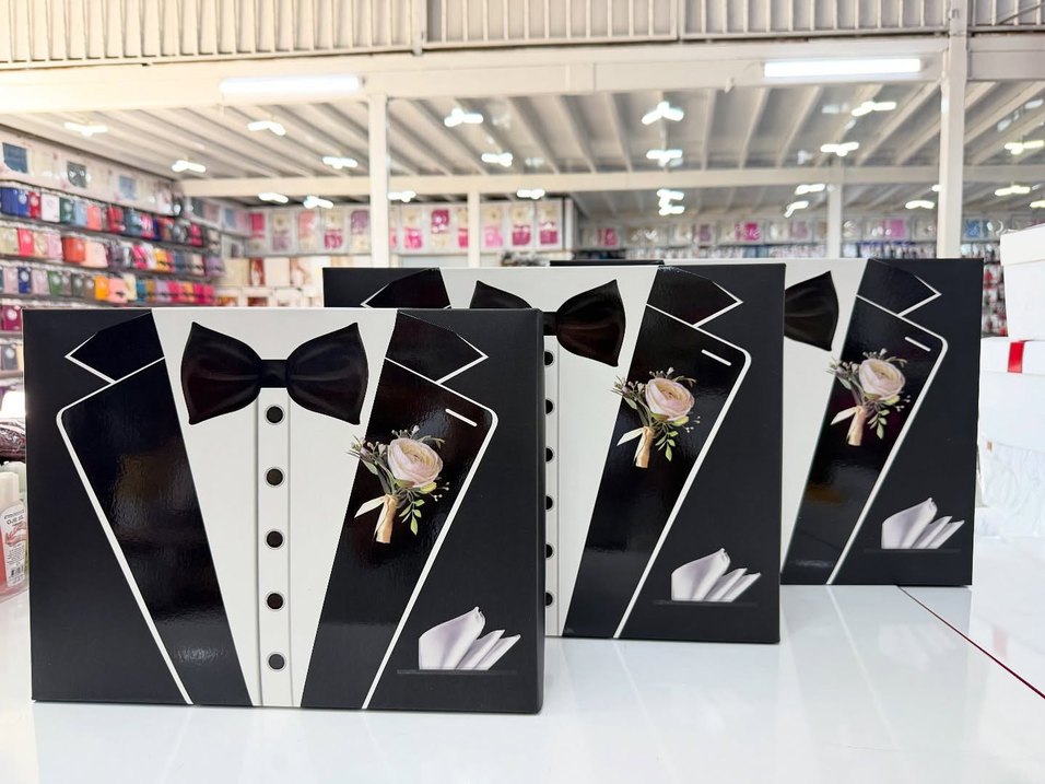 Düğün için baskılı beyaz mini smokin kartı, keskin yaka ve kurdele detayıyla klasik şıklığı çağdaş tarzla buluşturuyor.