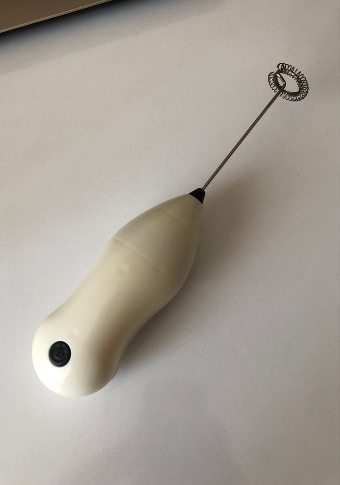 Basit tasarımlı beyaz mini el mikseri, tek düğme ile kolay kullanım sağlar. Hızlı karıştırma işleri için uygundur. ️