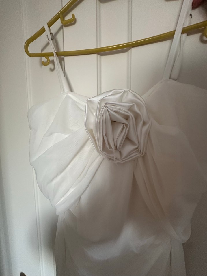 İnce askılı, straplez yaka ve modern klasik stilde, vücuda oturan beyaz mini elbise. Göğüs kısmında çiçek detaylıdır. Eyyo marka.