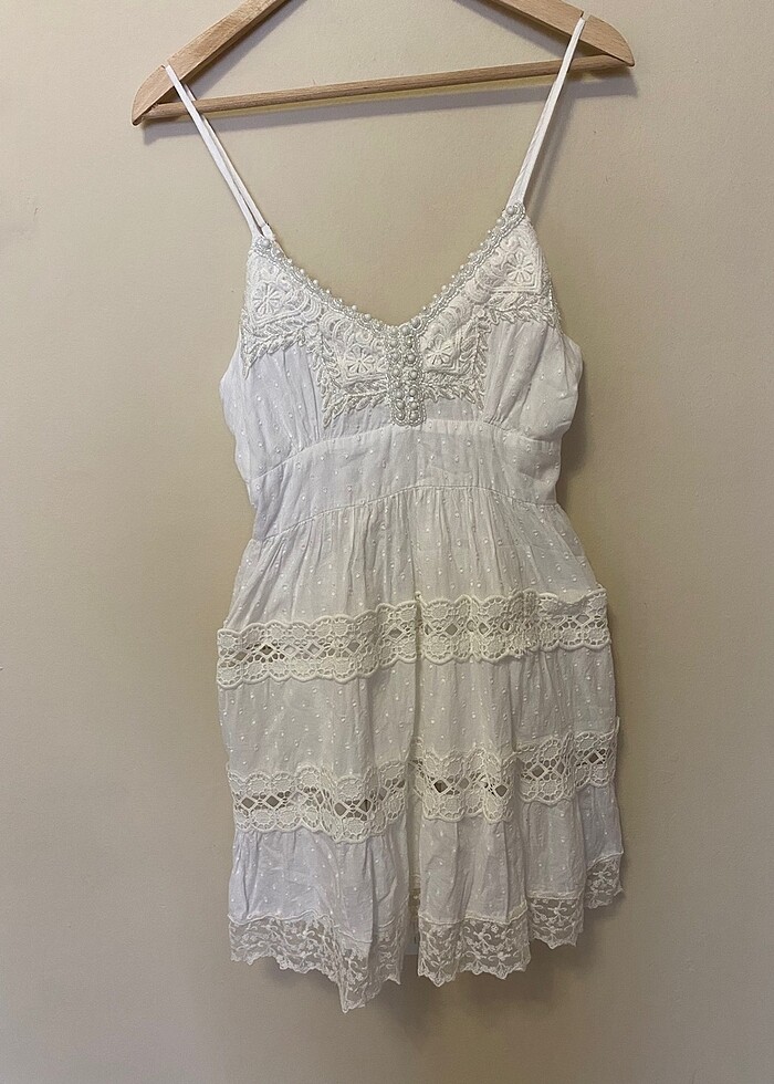Beyaz mini elbise bekarlığa veda için almıştım ama başka bir elbise giydim boncuk işlemeleri ve dantel detaylı kusursuz harika bir elbise etiketi üzerinde bohem tarzda S-M beden uyumlu l bedene olmaz dar kalıp şu an ki fiyatı 1.280 tl den 960 tl ye düşmüş ben aldığım zaman indirim yoktu